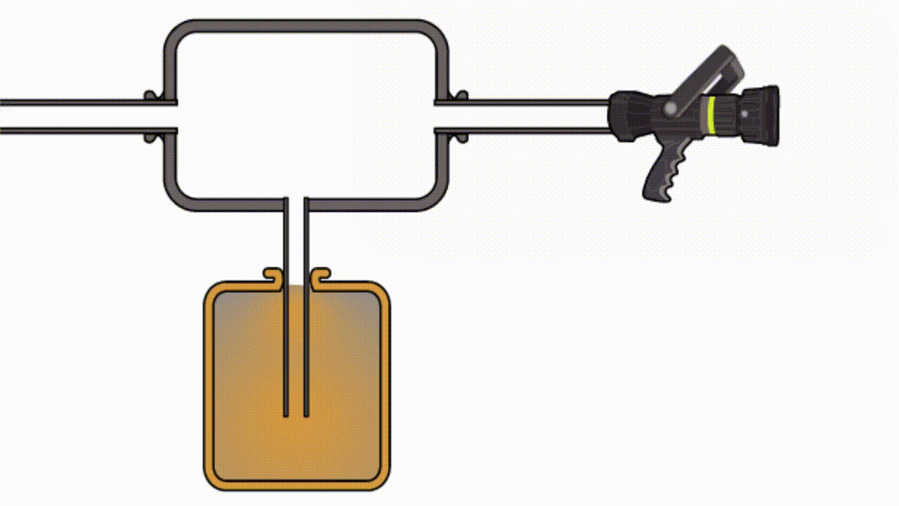 فوم غلیظ قبل از اینکه با آب مخلوط شود در مخزنی خاص ذخیره می شود. این مخزن که به مخزن کیسه ای (Bladder Tank) معروف است برای این نوع از سیستم های اطفاء حریق ساخته و پرداخته شده است. این مخزن یک کیسه ضخیم لاستیکی یک تکه در خود دارد که فوم غلیظ را در خود نگهداری میکند. بیرون کیسه در فضای بین کیسه و بدنه فلزی مخزن با آب پر شده است. این آب در زمان اطفاء حریق به کیسه حاوی فوم فشار آورده و باعث انتقال فوم از مخزن به مخلوط کننده شده و مخلوط آب و فوم را می سازد. فیلم زیر این روند را نشان می دهد.