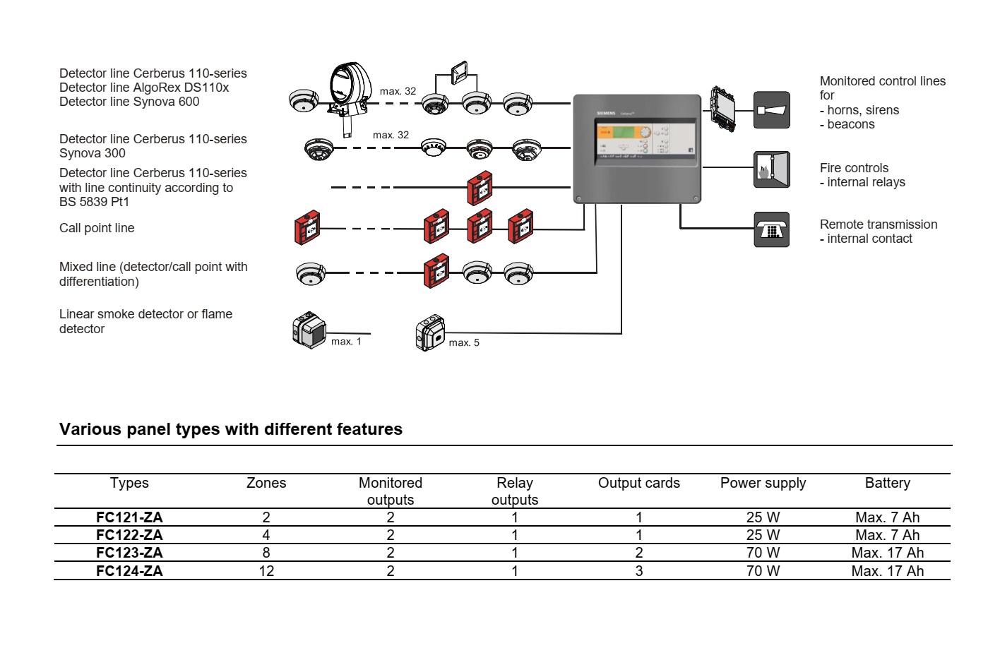 این کنترل پنل دارای 4 سری FC121 تا FS124 که با تعداد زون های 2، 4، 8 و 12 به صورت متعارف بوده و امکان ارتباط با 32 آشکارساز و شستی دستی را در ر زون فراهم میکند.